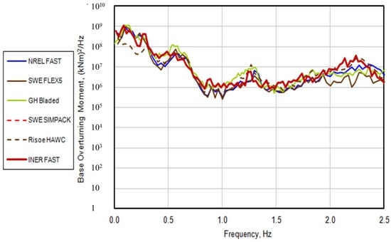 The environmental effect is included in Load Case 5.3. The wind conditions and wave conditions are given according to OC3 Phase I standards. Partial analysis results under Load Case 5.3 are shown in Figure 4 and Figure 5. Figure 4 is the variation of base shear force under stochastic wind flow. Figure 5 is the variation of base overturning moment under drastic wave conditions. The analysis results by individual OC3 research teams are similar in the frequency interval of 0–1.5 Hz. However, for frequency beyond 1.5 Hz, significant analysis errors between individual teams have been observed due to the difference of simulation settings and applied analysis methods. Since the variations of turbulent wind and irregular wave are given randomly, the simulation results of individual teams can hardly be identical. That is why there are analysis errors between NREL and INER in Figure 4 and Figure 5, though the OWTG model and analysis software of the two teams are the same.