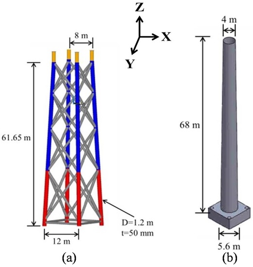 Assessment of structural reliability for OWTGs is a challenging task. Estimation of the loading effect is necessary due to the large variability in environmental conditions. A method to estimate the failure probability for OWTG support structures has been proposed [2]. Both monopile and jacket support structure were investigated. The uncertainties of soil stiffness and aerodynamic damping are evaluated by Monte Carlo integration. According to the simulation results, the system reliability of monopile is highly determined by the environmental uncertainties while the jacket support structure is more robust against the uncertainties and modeling errors. A similar research for the calibration of safety factors and fatigue design factors for OWTG substructures was reported. A reliability-based approach and a probabilistic model have been proposed to evaluate the acceptable reliability level for fatigue failure of OWTG substructures [3]. Based on the WTG component design data quoted from global manufacturers in USA, Asia and Europe, towers, blades, the jacket foundation support structure and generators contribute to 25%–30%, 15%–26%, 15% and 7% of an OWTG cost, respectively [4]. Being one of the main cost components in a typical offshore wind project, the substructure cost generally increases with the water depth, due to the complexity of the structural design and manufacturing process, as well as the additional material cost [5,6]. A comparison study was conducted between a conventional four-legged and a newly-developed three-legged bottom fixed jacket substructure for OWTGs [7]. Fatigue and ultimate limit state analyses were performed to verify the efficacy of three-legged jacket substructure.