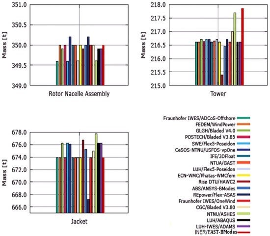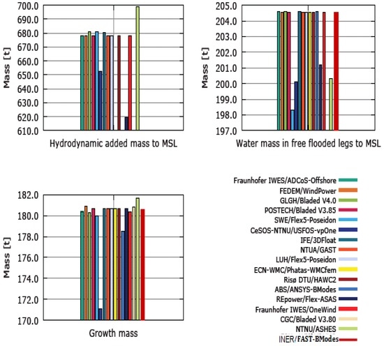 Moreover, the hydrodynamic mass and marine growth, which are shown in Figure 9 and Figure 10, respectively, are taken into consideration as well. The OWTG is expected to be installed in Taiwan Strait and the corresponding water depth is 50 m. The equivalent hydrodynamic mass is estimated at the water depth of 50 m below mean sea level (MSL) and the marine growth is only engaged within the water depth range of 2–40 m below MSL (see Table 3 [27]). Similarly, a comparison between the simulation results by INER and ABS is accomplished in Table 4. It can be observed that nearly negligible errors exhibited between these results of the two research teams.
