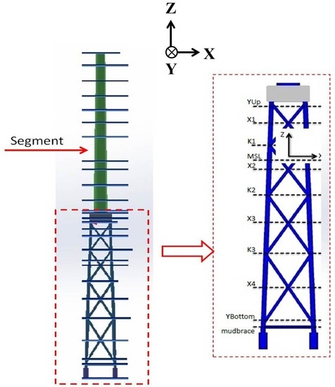 Based on similar assumptions mentioned in Ref. [28], the combination of OC4 jacket substructure model and simplified OWTG model can be represented by the verified mass, equivalent modes and partial load cases. After the contour construction using commercial CAD software (see Figure 6), the modal evaluation can be performed with the aid of freeware BModes 3.0. The definition of “segment” is illustrated in Figure 11. The tower and jacket substructure have been divided into several sections (segments) for modal analysis. The modal analysis results for various segment numbers are compared with the results in Ref. [28] and the error should be within 5%. Some of the modl analysis results of the combined model are listed in Table 5. These analysis errors in Table 5 are mainly from the model simplification. Since the results belonging to segment number of 40 are the closest to the results of Ref. [28], the simulation results of 40 segments model are employed in the following simulations.