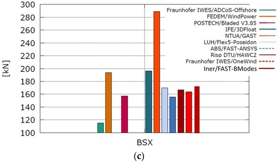 Analysis Results for Load Case 2.4b of OC4 Phase I. (a) PDF_Tower-Top Fore-Aft Shear Force; (b) PDF_Fore-Aft Shear Force at Mudline; (c) DEL_Fore-Aft Shear Force at Mudline. PDF: Power Density Function; BSX: Fore-Aft Shear Force at Mudline; DEL: Damage Equivalent Load.