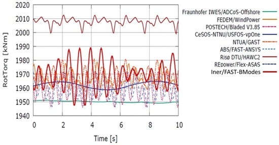 The OWTG (including RNA and tower) is assumed to be fully flexible and the steady wind flow is applied. Load Case 3.2 is focused on the influence of tower shadow effect. The dynamics of low-speed shaft torque is revealed in Figure 13. These data are obtained during the time interval of 30–40 s of the simulation period (the simulation data of the first 30 s is dropped according to the OC4 recommendation). The torque fluctuation is induced due to the tower shadow effect. Since there are three blades equipped with the OWTG, the blade passing frequency is three times the OWTG rotating frequency. The trend of torque fluctuation of the present results is similar to those by most of OC4 research teams.
