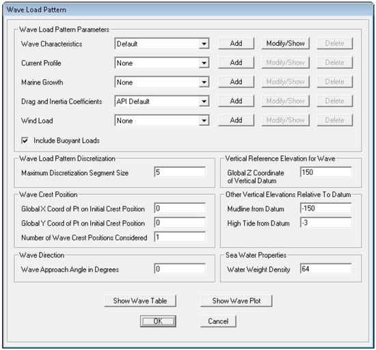 Totally, there are eight categories of DLCs (Design Load Cases) in IEC 61400-3 standard, as listed in Table 7. Since typhoons hit Taiwan every year, DLC 6 series have been employed to inspect the support structure strength. The standard process for the WTG against approaching Typhoons in Taiwan is to regulate the blades to be pitched-down, apply breaks on the main shaft (parked) and release the yaw (free yaw). In addition, the electrical network is usually lost after the Typhoon lands on Taiwan and the overall situation is similar to the conditions defined by DLC 6.2a and 6.2b. There are totally 1296 and 216 situations for DLC 6.2a and DLC 6.2b, respectively (Table 8), due to various wind conditions, waves, sea currents, and water level. All of these situations have been investigated by INER and finally six conditions (Case 1–Case 6) corresponding to maximum loading of individual terms are selected, as shown in Table 8. It should be noted that the variables of Case 2 and Case 4 are identical because of the y-axis maximum force and x-axis maximum moment are both taken place under this environmental setting. The influence of wave, current, marine growth, external water pressure and OWTG dynamics is also included in the following simulations (see Table 9 and Figure 15 for more details). The simulation of water pressure influence is achieved using the software package SAP2000. The automatic wave load is a special type of load pattern commands in SAP2000 (Figure 16). The structural loadings due to waves, current flow, marine growth, buoyancy and wind can be enclosed simultaneously in one simulation via this load command. Wave velocity and acceleration fields could be automatically generated by using airy (linear), stokes or cnoidal wave theories or, alternatively, they can be directly input by the user. Current velocity and direction, marine growth, drag coefficients and inertia (mass) coefficients are all specified as a function of water depth. Wind load, acting in any direction, can also be specified as a part of the wave load. The wind load acts on the portion of the structure that is above the wave surface.