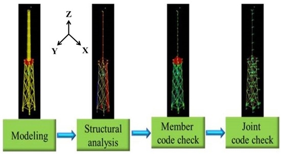 For OWTG support structure analysis, the software Bladed (DNV GL, Oslo, Norway) can be employed to implement the analysis. However, this commercial program was not adopted by every research teams due to its cost and the limitation of source code modifications. In this work, a simplified and low cost analysis procedure for OWTG jacket substructure has been proposed. The analysis flowchart for OC4 jacket substructure model is displayed in Figure 2. The first step is to build the CAD (Computer-Aided Design) profile of the OC4 jacket support structure and then simplify it to be a monopile model with the aid of freeware BModes 3.0 [23]. The essential information for equivalent monopile model construction, such as the density, cross-sectional area, young’s module and area moment of inertia, are evaluated according to the CAD profile of jacket substructure. Both of the OWTG model and the equivalent monopile model will be employed to investigate the operation loadings. The full jacket substructure model is finally analyzed under these operation loadings with the aid of Software SAP 2000 [24].