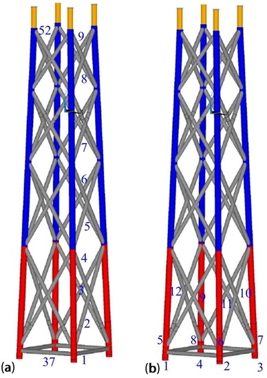 The resulted forces and moments at tower top for Case 1–Case 6 are listed in Table 10. These loadings are estimated with the aid of freeware FAST and the analysis rules of IEC 61400-3 standard. These maximum forces and moments will be defined as the ultimate limit state (ULS) for the following structural analysis. The model construction of OC4 jacket substructure is introduced in Figure 17. All of the involved components are fulfill with the requirements of NORSOK N-004 [18] and API RP 2A-WSD [19] standards. More details regarding the difference between the two standards can be found in Ref. [31]. The used safety factors of WSD and the load and resistance factors of LRFD are defined in Table 11 and Table 12, respectively.