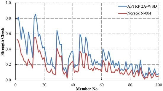 The following simulations for OC4 jacket substructure model are implemented with the aid of software SAP2000 [24]. The joints are assumed to be perfectly connected. As a result, the local joint flexibility and the overlap of joints have not been taken into consideration in this work. The definitions of “Member No.” and “Joint No.” for jacket substructure are illustrated in Figure 18. Each leg (the dotted line in Figure 18) is divided into nine members and totally 36 members define for four legs. The chords between four legs are divided into 64 members. As a result, a jacket substructure is composed of 100 members. On the other hand, the joint is numbered bottom up and counterclockwise. The simulation results of member strengths for Case 1–Case 6 are shown in Figure 19, Figure 20, Figure 21, Figure 22, Figure 23 and Figure 24, respectively.
