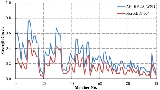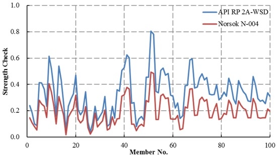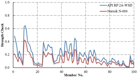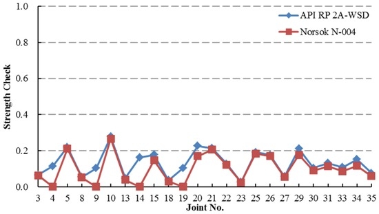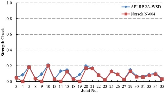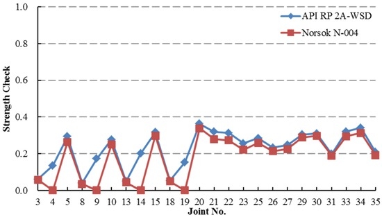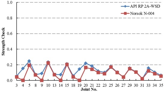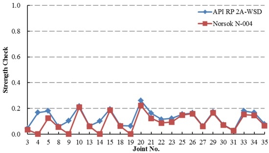 All of the member strengths by API standard are higher than those by NORSOK standard. In other words, API standard is more conservative against the structure components design than NORSOK standard. Furthermore, the strengths of the first 20 members are generally stronger than that of rest members. This is because those members are located close to the bottom of jacket structure (close to the seabed). Based on these results, more attention should be paid to the bottom structure design of jacket substructure regarding the loading of axial forces and moments. The resulted punch shear strengths for joints are demonstrated in Figure 25, Figure 26, Figure 27, Figure 28, Figure 29 and Figure 30. It is obvious that the joint shear strength in Case 6 is higher than those of the other cases. The induced torsion in Case 6 (see Table 10) becomes a loading to the jacket structure and finally leads to the increase of shear strength. However, all of the simulation results are within the safety threshold.