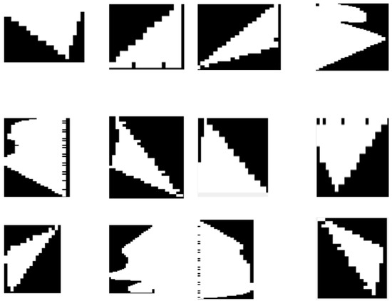 - The silhouette is divided into 12 radial bins with respect to its centroid using a mask; this division has been made with intervals of 30°. These bins are shown in Figure 4.
