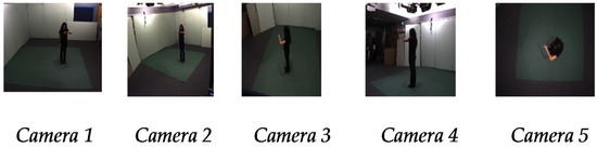 The IXMAS is a challenging and well-known dataset with multiple actors and camera views. This dataset is popular among the human-action recognition methods for testing view-invariant action recognition algorithms, including both multiview and cross-view action recognition. It includes 13 daily life action classes with 5 different cameras, including one top-view and four side cameras, as shown in Figure 5. Each action is performed 3 times by 12 different subjects while actors keep changing orientations in each sequence during action execution. The change in orientation is indicated by action labels, and no additional information is provided other than these labels. Most of the existing methods use selected action classes and actors for experimentation [19,29]. For comparison, we have selected 11 action classes performed by 12 actors as shown in Figure 6. The name and the label index of these actions are shown in Table 1.