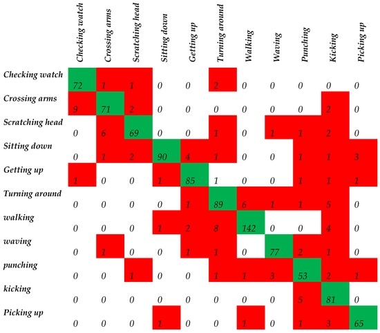 Our method achieves a recognition rate of 89.75% with leave-one-sequence-out (LOSO) cross-validation on 11 actions. The recognition rate of individual action is presented in a confusion matrix, shown in Figure 7. The results confirm that our method outperforms the similar state-of-the-art 2D based methods such as [12,19,21,24,29,48,49,50,51,52] recorded in Table 2. It is important to be mentioned here that the number of classes, actors, and views used in experimentations vary among these methods. For example, in [52], 89.4% accuracy has been reported but they excluded camera 4 from experimentation. Likewise, [51] also excluded the top camera and considered only the remaining 4 cameras. Moreover, most of the published methods are not appropriate for real-time application due to their high computational cost. The proposed method considers all views of the IXMAS dataset including the top view for recognition. The results indicate that the proposed method is superior to the similar 2D methods, not only in recognition accuracy but also in recognition speed as well.