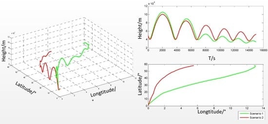 where = 5000 m/s, = 4500 m/s, and ; t denotes the flight time. Equation (37) shows the HGV maneuvers laterally at the biggest degree. Furthermore, in the real world, controlling the bank angle cannot jump 20° immediately. The change law of Equation (37) is to challenge the tracking algorithm in simulation. Equation (38) shows the HGV maneuvers laterally by the bank angle changing in the sine law with period 80 s and amplitude 20°. Then, two HGV trajectory scenarios can be generated as Figure 1.