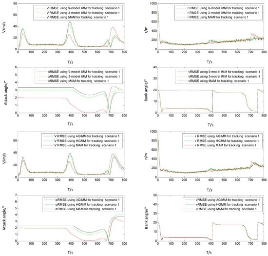 Using MAM algorithm has reduced the average V RMSE by 9.36% than using three-model IMM algorithm for tracking Scenario 1, by 9.52% than using AGIMM algorithm for tracking Scenario 1, by 8.45% than using HGMM algorithm for tracking Scenario 1, by 12.18% than using three-model IMM algorithm for tracking Scenario 2, by 12.20% than using AGIMM algorithm for tracking Scenario 2, by 9.50% than using HGMM algorithm for tracking Scenario 2, respectively. Using MAM algorithm has reduced the average r RMSE by a certain degree than using other algorithms. The results that MAM (single model) algorithm outperforms other algorithms mentioned in this paper for tracking HGV trajectories contradicts the usual opinion that multiple model tracking algorithm outperforms single model (MAM) tracking algorithm for this so-called strong maneuvering target.