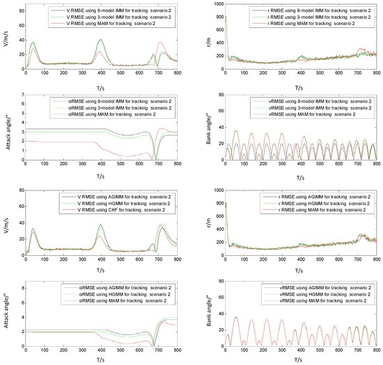 As defenders, velocity tracking error and position tracking error are the main indicators for HGV tracking performance [2,6,8] and more general target tracking performance [37,38,39]. Thus, in following tracking performance comparison, we mainly use velocity RMSE and position RMSE. V RMSE and r RMSE can represent the RMSE of velocity and position, respectively. Moreover, the attack angle error and bank angle error at discrete time k have a certain effect on the velocity and position at discrete time k+1. Thus, V RMSE, r RMSE, RMSE and RMSE using different algorithms will be compared and analyzed as follows.