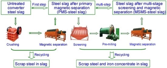 - Zhang, T.S.; Yu, Q.J.; Wei, J.X.; Li, J.X.; Zhang, P.P. Preparation of high performance blended cements and reclamation of iron concentrate from basic oxygen furnace steel slag. Resour. Conserv. Recy. 2011, 56, 48–55. [Google Scholar] [CrossRef]