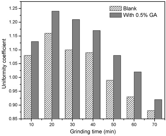 The uniformity coefficient of steel slag powder can reflect the extent of the width of particle size distribution, and the smaller the uniformity coefficient, the wider the particle size distribution. From Figure 10, it can be seen that the uniformity coefficient of steel slag powder is firstly increased and then gradually decreased with the increasing of grinding time. By comparison, the uniformity coefficient of steel slag powder with GA is larger than that without GA for the same grinding time, indicating that the particle size distribution of steel slag powder can be narrowed by GA. The effect is the strongest at 50 min and 60 min grinding times.