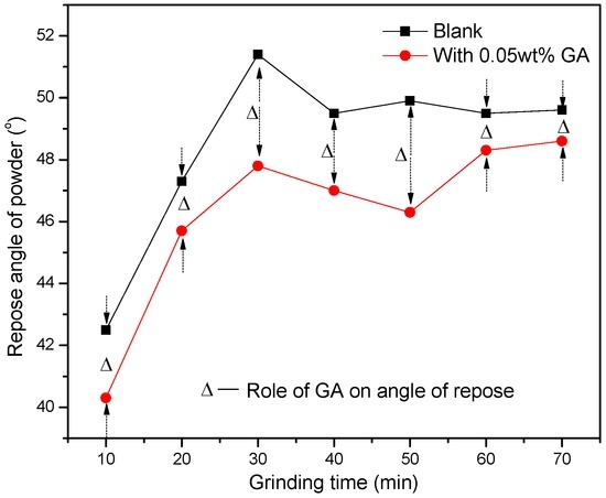 Powder fluidity is usually characterized by the angle of repose. The smaller the angle of repose, the better the powder fluidity. As shown in Figure 11, it can be seen that the angle of repose of steel slag powder is decreased after adding GA, indicating that GA can improve the fluidity of steel slag powder. The role of GA on the angle of repose is firstly enhanced and then weakened on the whole, which is similar to the role of GA on the sieving residue, and it is reaches maximum effectiveness at 50 min grinding time, i.e., the action effect of GA on powder fluidity is the greatest at 50 min grinding time.