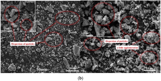 The particle morphologies of steel slag powder with and without GA are shown in Figure 12. It can be seen from the figure that the particles of steel slag powder without GA exhibit the agglomeration phenomenon where fine particles adhere to each other. Especially at 70 min grinding time, agglomeration of particles is very serious and many large particles are regenerated by adhering of fine particles. By comparison, after using GA, the agglomeration phenomenon of particles is not obvious at 50min grinding time, still keeping a relatively good dispersion. Although the particles with GA also exhibit a little agglomeration at 70 min grinding time, their dispersion is still obviously better than those without GA. The above results confirm that GA can efficiently weaken the agglomeration of fine particles when particle size becomes small and agglomeration of fine particles occurs.