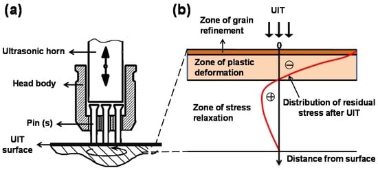 (a) Schematic view of the impact head of ultrasonic impact treatment (UIT); (b) Sectional view of the surface region for the sample treated by UIT.