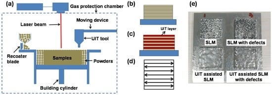 Schematic view of (a) UIT assisted selective laser melting (SLM); (b) SLM sample and (c) UIT assisted SLM sample; (d) scanning path of UIT; (e) four samples in this study.