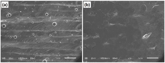 Scanning electron microscopy (SEM) images showing the typical surface morphology of (a) SLM sample; (b) UIT assisted SLM sample.