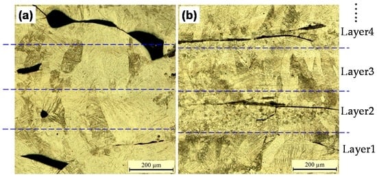 Optical microscopy (OM) images showing the typical macrostructure of (a) of SLM sample with defects and (b) UIT assisted SLM sample with defects, the hatch spacing of two samples is 0.8 mm.
