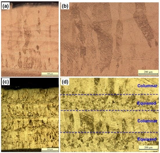 OM images showing the typical (a,b) macrostructure and grain morphology of SLM sample; (c,d) macrostructure and grain morphology of UIT assisted SLM sample, all samples’ hatch spacing is 0.6 mm.