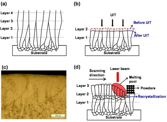 Next, the grain evolution during UIT assisted SLM is proposed as shown in Figure 6. Firstly, during SLM process, there is high temperature gradient due to rapid heat loss through the substrate or previously deposited layers. This results in the epitaxial growth of β grains as schematically shown in Figure 6a [5,17], and hence leads to the long columnar grain morphology in SLM samples (see Figure 5a). During UIT assisted SLM process, when layer 1 and 2 (counting from the bottom layer) are deposited, the columnar grains are also formed. Then, the UIT is applied. Compressive plastic deformation occurs in the surface region as schematically shown in Figure 6b. There are two possible mechanisms for the formation of fine equiaxed grains. One is dynamic recrystallization, which occurs during heavily plastic deformation. The other is reheating and recrystallization. In this case, the sample may also be subjected to some extent of deformation, but the deformation extent is not high enough to directly induce recrystallization. Here, dynamic recrystallization is thought to be not the key mechanism due to the following two clues. Firstly, according to previous research, the depth of dynamic recrystallization zone (i.e., zone of grain refinement in Figure 1b) is generally only about 10–30 μm [13,14], which is too thin to be observed. Meanwhile, it can be completely remelted during the depositing of next layer. Furthermore, the depth of the equiaxed grain regions observed in Figure 5d is significantly larger than this value. Secondly, dynamic recrystallization can results in very fine grain size (about 20–100 nm) [13,14]. However, the averaged equiaxed grain size is about 20 μm. Accordingly, it can be inferred that the fine equiaxed grains generate in the plastic deformation zone, because the compressive plastic deformation can induce high dislocation density and internal energy storage in this zone. During the depositing of Layer 3 (see Figure 6d), the rapid heating will lead to the recrystallization in the heat treated zone under the melting pool. Therefore, the fine equiaxed grains gradually form, and the grain morphology turns to be bamboo-like.