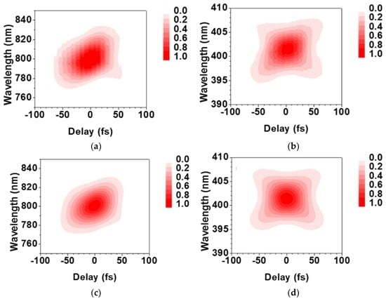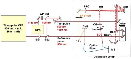 In the experimental setup (Figure 1), a portion of the near-infrared (NIR) optical pulse from a Ti:sapphire regenerative amplifier (35 fs, 800 nm, 4 mJ, 1 kHz, Legend Elite-USP, Coherent Inc., Santa Clara, CA, USA) and a pulse at 1180 nm generated by an optical parametric amplifier (OPA, OPerASolo, Coherent Inc.) pumped by the Ti:sapphire regenerative amplifier were spatially and temporally overlapped to form a two-color femtosecond pulse. This two-color pulse was used as a test pulse while a portion of the NIR pulse from the Ti:sapphire regenerative amplifier (800 nm) was used as a reference pulse for the XFROG measurement.