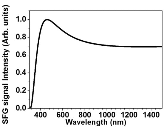 An XFROG trace was obtained using the reference pulse characterized by the above procedure. For this, one of the two replicas of the reference pulse reflected on BS3 (Figure 1) was blocked, and the transmitted beam through the beam splitter was used to gate the test pulse to be characterized. The test pulse consisting of the two-color components was non-collinearly focused into the 5 μm BBO crystal together with one of the replicas of the reference pulse using the concave mirror (CM1 in Figure 1). The angle of the crossing beams was adjusted to be less than ca. 2 degree to avoid geometric smearing. The generated sum-frequency signal between the replica and test pulses was focused onto the multichannel spectrometer to obtain the XFROG trace. The energy ratio between two optical pulses is measured using a power meter (PM10X, Coherent Inc.). This multichannel spectrometer is calibrated to compensate for the change in the spectral response. Phase matching of the SHG and SFG signals using the crystal needs to be considered []. Figure 2 shows the phase matching curve calculated by a homemade LabVIEW software (LabVIEW8.6, NATIONAL INSTRUMENTS, 2008, Austin, TX, USA) when using the 800 nm optical pulse as a reference pulse and a 5 μm BBO crystal. A flat phase matching curve is obtained from 800 nm to 1180 nm and from 340 nm to 1500 nm after compensation for a spectral response, supporting a spectral bandwidth allowing a measurement of 1.2 fs optical pulse.