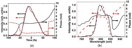 Using one of the aluminum-coated D-shaped mirrors (Figure 1, BS3), the reference pulse was split into two parts. One passed through an optical delay line controlled with a closed-loop piezoelectric actuator. These two laser pulses were non-collinearly focused into an SD medium (cover glass, thickness 170 μm) by an aluminum-coated concave mirror (f = 200 mm). The generated SD signal was focused into an optical fiber (QP200-2-VIS-BX, core diameter 200 μm, length 2 m, Ocean Optics, Dunedin, FL, USA) equipped with a multi-channel spectrometer (Maya2000-Pro, Ocean Optics) by a fused-silica lens (f = 50 mm). By scanning the time delay using the piezoelectric actuator, the SD FROG trace was obtained for the reference pulse. A pinhole was used to extract the SD signal. The mirror in front of the SD medium (RM in Figure 1) was then removed to guide the two split pulses into a 5-μm-thick type-I beta-barium borate crystal (BBO, cutting angle φ = 90° and θ = 45°) to generate the second harmonic of the reference pulse. The distance from RM to the BBO crystal is designed to the same value to that from RM to the SD medium. The silver mirror (RM) has a flat curve for the reflection ratio between 750 nm and 850 nm. For these reasons, the difference in the optical pass is negligible. By focusing the SHG beam into the optical fiber-coupled multi-channel spectrometer using a concave mirror (f = 50 mm) and scanning the time delay using the piezoelectric actuator, the SHG FROG trace was acquired for the reference pulse. A pinhole was used to extract the SHG signal. All the phase retrievals in the present research were performed using commercial software (FROG3.1.2, FemtoSoft Technologies, 2004, Burlington, MA, USA), and random noise signals were used as initial guesses.