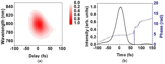 The SD and SHG FROG traces measured for the reference pulse are shown in Figure 3a,b, respectively. The SD FROG trace is slightly tilted with respect to a time delay, indicating that the reference pulse was slightly negatively chirped. In contrast, the shape of the SHG FROG trace indicates the presence of the third-order spectral phase distortion []. The SHG FROG trace is nearly symmetric; the slight asymmetry is considered to be caused by the slight spatial chirp of the pulses or by the nature of the optics used in this study. To evaluate the reliability in the characterization of the reference pulse, the two temporal intensity profiles of the reference pulse retrieved from the SHG and SD FROG were compared. The FROG errors [] in the SD FROG and the SHG FROG were 0.4% and 0.5%, respectively, at a grid size of 256 × 256. The small FROG errors suggest that the traces are completely retrieved. In general, two kinds of electric fields are randomly given from a single SHG FROG trace, one of which is the complex conjugated time-reversed replica of the other []. One of them was in good agreement with the field retrieved from the SD FROG trace. The temporal intensity profiles (Figure 4a) retrieved from the SHG and SD FROG traces coincide with each other. The duration of the reference pulse determined by SHG FROG was 58 fs, whereas its duration as characterized by SD FROG was 59 fs; these results are nearly identical. Although the FROG medium and the optical path to the point of measurement are different in these techniques, the temporal phases retrieved from the two FROG traces are in good agreement in the temporal range between −50 fs and 50 fs where 97% of the total energy of the reference pulse is contained. As shown in Figure 4b, the spectral intensity profiles retrieved from the SHG and SD FROG traces are nearly identical to each other. Also, these two FROG analyses converged after 50 to 70 iterations and are reproducible. Note that the SD FROG system allows the characterization of the reference pulse without the ambiguity in the direction of time. On the other hand, it is necessary to check the direction of time by inserting a thin glass plate in the beam path for the SHG FROG measurements []. If the time-reversed replica instead of the correct temporal profile was used in the phase retrieval from an XFROG trace, the analysis would lead to a large error in the evaluation of the test pulse []. For this reason, SD FROG is preferred for the characterization of a reference pulse. The characterized reference pulse was slightly negatively chirped. A fused-silica plate with a thickness of 19 mm was then placed in the beam path of the reference pulse to minimize the pulse duration. The SD FROG trace measured for the compressed reference pulse (Figure 5a) yields the temporal profile of the reference pulse after phase retrieval (Figure 5b). This compressed reference pulse (43 fs) was then used in the following XFROG measurements. Note that the temporal intensity of the pulse (Figure 5b) is slightly steeper in the trailing edge than the leading edge, which is in contrast to the reference pulse of Figure 4. The feature of the temporal profile would be related to the ratio between the second-order and third-order spectral phases in the pulse. A numerical simulation performed assuming a positive cubic spectral phase in the pulse qualitatively reproduced this temporal behavior. The temporal intensity profile of a laser pulse with a negligibly small second-order phase distortion and a large amount of positive third-order spectral phase distortion is noted to have a steep trailing edge, whereas that with a non-negligible second-order phase distortion and a large positive third-order spectral phase distortion has a steep leading edge.