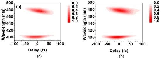 An XFROG trace was measured for the test pulse using the reference pulse shown in Figure 5. The trace consisted of two spectral components (Figure 6a), each of which was generated by the cross-correlation between the reference pulse and one of the two spectral components in the test pulse. The FROG signal measured at 400 nm was generated by sum-frequency mixing between the reference pulse (800 nm) and the pulse at 800 nm contained in the test pulse (hereafter denoted as pulse A). In contrast, the signal at 480 nm was generated by sum-frequency mixing between the reference pulse and the other pulse in the test pulse (1180 nm, hereafter denoted as pulse B).