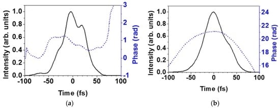 - Trebino, R.; Kane, D.J. Using phase retrieval to measure the intensity and phase of ultrashort pulses: Frequency-resolved optical gating. J. Opt. Soc. Am. A 1993, 10, 1101–1111. [Google Scholar] [CrossRef]
