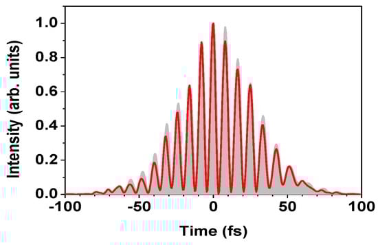 When two color pulses temporally overlap, an optical beat is generated to form a sinusoidal wave with a period determined by the frequency separation. The XFROG trace measured for the test pulse (Figure 6a) indicates that the two femtosecond pulses in the test pulse had temporally overlapped with each other. The temporal intensity profile of an optical beat is determined by the following five parameters: (a) frequency separation; (b) temporal separation; (c) relative intensities at the two frequencies; (d) spectral intensity profile and phase of the two pulses; and (e) relative spectral phase. The four parameters (a–d) are given by the present XFROG measurement. The frequency separation, ca. 4155 cm−1, can be evaluated from the location of the two spectral components. The temporal separation between the two pulses forming the test pulse is evaluated from the relative time delay of the two components in the FROG trace (Figure 6a). The time delays are slightly different from each other, indicating that the two pulses at 800 nm and 1180 nm in the test pulse had not completely overlapped. The relative intensities at the two frequencies are evaluated from the relative intensities of the two signals in the XFROG trace. The spectral intensity profile and the phase of the two pulses are retrieved from the FROG trace as discussed in the previous section. Unfortunately, the relative spectral phase cannot be measured from the FROG trace because of the longer duration of the reference pulse than the spacing of the optical beat. Such a relative spectral phase would provide information of the temporal intensity profile of the optical beat; the envelope of the pulse is determined by the temporal intensity profiles of the two color pulses (Figure 7a,b). This is because the two waves are periodically in phase somewhere within the envelope as long as the width of the envelope is longer than the period of the optical beat. The spacing of the beat is determined by the frequency separation of pulses A and B, not by the relative phase. This would not be the case for an ultrashort optical pulse synthesized using more than two discrete spectral components [], for instance a pulse train synthesized using multicolor laser emissions generated via FWM [,,,]. The characterization of an optical beat formed by two-color laser beams is useful for the evaluation of the bandwidth available in the diagnostics. The accuracy in the relative spectral intensities of the two spectral components retrieved in the FROG analysis allows us to judge whether the diagnostic tool has a broader bandwidth than the frequency separation between the two color pulses or not. The present result suggests that the spectral range is covered from 800 nm to 1180 nm. The FROG error in the phase retrieval was 0.4% at a grid size of 1024 × 1024. The retrieved XFROG trace (Figure 6b) was in good agreement with the measured XFROG trace (Figure 6a). In the retrieved spectral intensity profile (Figure 9a), there are two spectral components corresponding to pulses A and B. The spectral intensity distribution of the two components agreed well with the shape of the spectral intensity distribution obtained in the phase retrieval, in which the FROG signals of pulses A and B were separately analyzed (see the first paragraph of this section). The ratio of the integrated spectral intensities of these pulses observed in the retrieved spectrum was calculated to be 1.0, which was in good agreement with the energy ratio (0.96) measured using a power meter. This indicates that the relative spectral intensities (Figure 9a) reflect relative intensities of the two pulses. In other words, the bandwidth of the XFROG system was sufficiently broad to support the width corresponding to the frequency separation of the two pulses, i.e., 4155 cm−1. Figure 10 shows the temporal intensity profiles retrieved from two XFROG traces measured independently. As expected from the above discussion, the two temporal intensity profiles of the optical beats are nearly identical to one another: only a slight difference in the relative intensities of the sharp peaks remains. The lack of information about the relative phase thus has given the ambiguity in the relative intensities of the optical beat and in the positions of the sinusoidal wave in the envelope. The other features of the temporal structure of the optical beat, which were determined by the four parameters (a–d), remained in these two measurements. As already discussed above, the two pulses at 800 nm and 1180 nm were not completely overlapping in time. This should result in a change in contrast of the optical beat; the highest contrast was observed in the middle of the temporal profile, while the lowest contrasts were at the leading and trailing edges where the two spectral components do not properly overlap. As mentioned earlier, the spectral component at 1180 nm was slightly positively chirped, resulting in a decrease in the instantaneous frequency separation between pulses A and B. Thus, the temporal separation of the two adjacent peaks increased at the trailing edge. Accordingly, the temporal structure retrieved from the XFROG trace is determined by the timing and the chirp of the two pulses. It is difficult to characterize a train of pulses with a spectrum consisting of multiple lines by the XFROG because of a lack of information concerning relative phases. However, the temporal waveform of the optical beat consisting of two discrete spectral components is changed only slightly by the change of the relative phase, although the beat is slightly shifted in time. The temporal intensity profile is reported to drastically change with a change in the relative phases among the spectral components when the test pulse consists of more than two discrete spectral components []. The present XFROG system would be capable of characterizing such an ultrashort single optical pulse with smooth temporal and spectral profiles even using