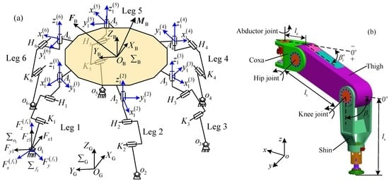 In Figure 1, the abductor joint, hip joint, and knee joint are, respectively, defined as Ai, Hi, Ki (i = 1, …, 6). The lengths of the coxa, thigh, and shin, respectively, set as lc, lt and ls. The included angle between the coxa of leg i and the thigh of leg i is defined as βi′ (i = 1, …, 6). βi (i = 1, …, 6) is regarded as the included angle between the coxa of leg i and the shin of leg i. The relations between βi′ and βi are 0° ≤ βi′ ≤ βi ≤ 90°. The body coordinate system of robot is set as ; it locates at the center of body. The gravity vector and the principal moment of the robot are, respectively, defined as FB and MB. The abductor joint coordinate system of leg i contains axis, axis, and axis. The axis is parallel to the ZB axis. The axis keeps parallel with the coxa of leg i. The leg i lies in the plan . The foot coordinate systems and of leg i are, respectively, parallel to the body coordinate system and the abductor joint coordinate system of leg i. expresses the coordinate system of ground.