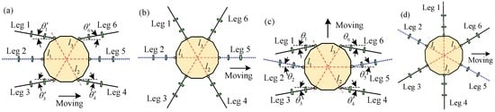Based on Figure 1 and Figure 2a, the expressions of the tangential forces of feet can be gained for legs 1, 2, 3, 4, 5 and 6 when the value of θi′ is zero. Thus,