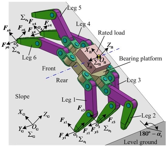Based on Figure 2, it can be concluded that the crab–ant mixed type I and crab–ant mixed type II can be transformed from the crab type or the ant type. Generally, we all know that the rearmost leg of robot experiences the maximum normal contact force when the robot passes along a slope. Then, the joints of the rearmost leg have the maximum values of torques in the homogeneous joints. According to the structure of leg and four kinds of typical walking ways, it can be concluded that the large static torques of the hip joint and knee joint can be obtained when the crab-type quadrangular gait is selected to overpass a slope. Thus, the support phase of the crab-type quadrangular gait can be only analyzed for gaining the torques of the hip joints and knee joints.