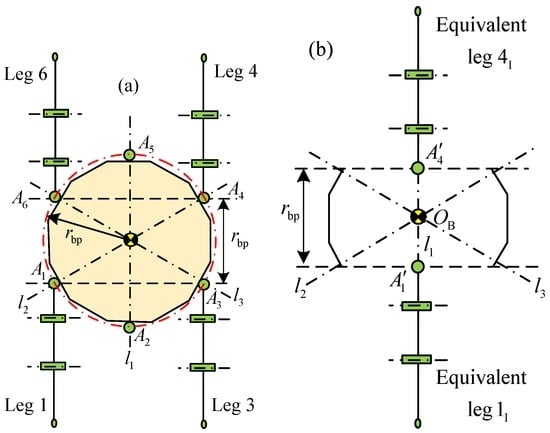 Working condition I of support phase: (a) support phase involving legs 1, 3, 4 and 6; and (b) equivalent support phase of legs 1, 3, 4 and 6.