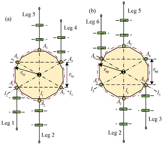 Working condition II of support phase: (a) support phase involving legs 1, 2, 4 and 5; and (b) support phase involving legs 2, 3, 5 and 6.