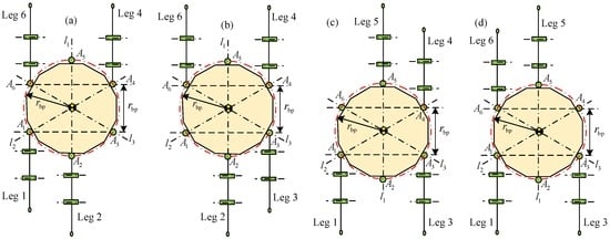Working condition III of support phase: (a) support phase involving legs 1, 2, 4 and 6; (b) support phase involving legs 2, 3, 4 and 6; (c) support phase involving legs 1, 3, 4 and 5; and (d) support phase involving legs 1, 3, 5 and 6.