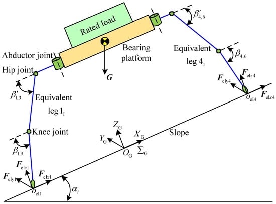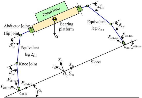 Based on Figure 4, legs 1, 3, 4 and 6 are parallel to the straight line l1. It is deduced that the poses of legs 1 and 3 are equal to each other. The pose of leg 4 is the same as the pose of leg 6. The equivalences are respectively carried out through legs 1, 3, 4 and 6 to the straight line l1. The equivalent legs are obtained and shown in Figure 7. Thus, the pose of the equivalent leg 1I is equal to the poses of legs 1 and 3. The pose of the equivalent leg 4I is equal to the poses of legs 4 and 6. According to the poses of legs in the support phase, it can be concluded that the moments of couples caused by the equivalence are mutually offset. The maximum static torques of the hip joint and knee joint can be obtained. Under a stable condition of the heavy-duty six-legged robot, the rotation angles of the homogeneous joints are equal. Then, the relations can be acquired: β′1,3 = β′4,6 = β1′ = β3′ = β4′ = β6′ and β1,3 = β4,6 = β1 = β3 = β4 = β6.