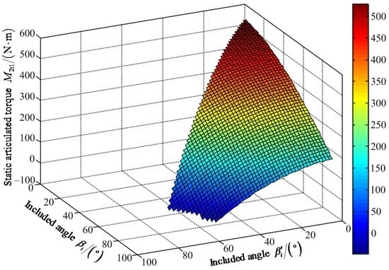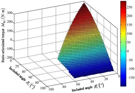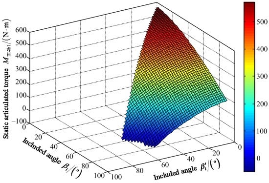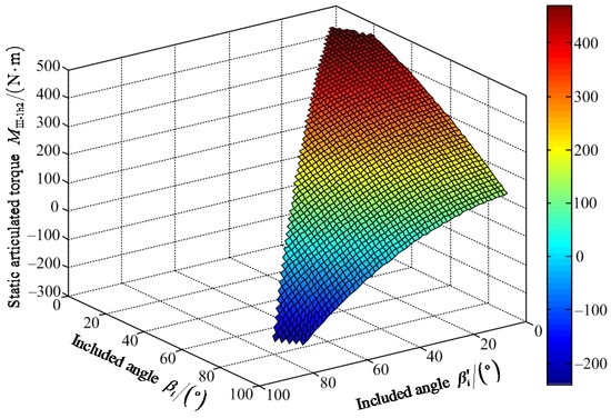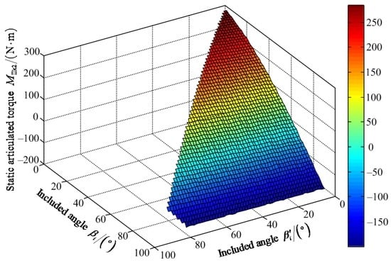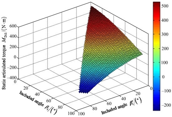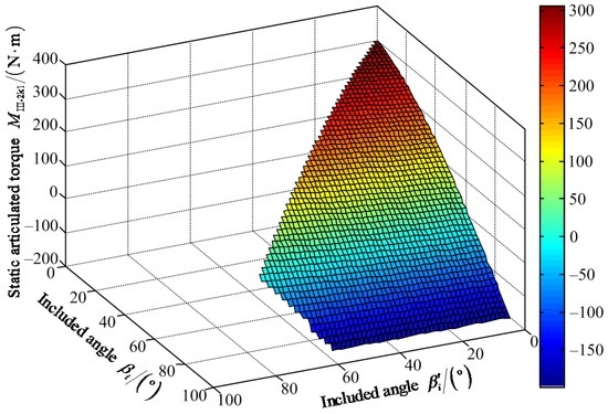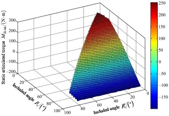 Figure 20 shows that the maximum value of FIII-2z1 is 1204.00 N when the value of included angle βi′ is 62° and the value of included angle βi is 85°. The minimum value of FIII-2z1 is 642.80 N when the values of included angles βi′ and βi are zero. Figure 21 shows that the maximum value of positive static articulated torque MIII-2h1+ is 589.50 N·m when the values of included angles are zero for βi′ and βi. The maximum value of negative static articulated torque MIII-2h1− is 47.89 N·m when the values of included angles βi′ and βi are 57° and 90°, respectively. Figure 22 shows that the maximum value of positive static articulated torque MIII-2k1+ is 305.30 N·m when the values of included angles are zero for βi′ and βi. The maximum value of negative articulated torque MIII-2k1− is 199.50 N·m when the value of included angle βi is 90° and the value of included angle βi′ can range from 0° to 57°. According to Figure 20, Figure 21 and Figure 22, it can be concluded that the included angle βi′ of the hip joint and the included angle βi of the knee joint are limited. Under the wording condition III-2 to pass the maximum slope, the included angle βi′ of the hip joint and the included angle βi of the knee joint should meet the flowing requirements: 0° ≤ βi′ ≤ βi ≤ 90° and 0° ≤ βi′ + βi ≤ 147°.