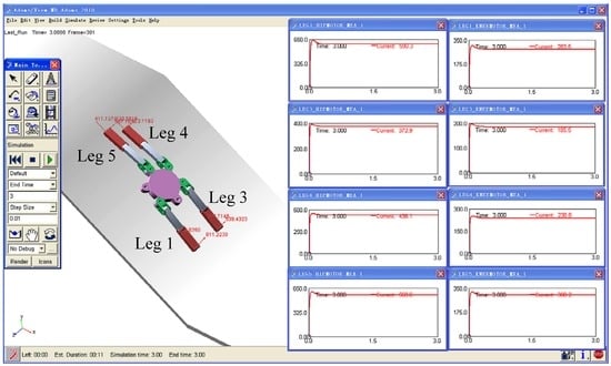 The structures of the shins have been simplified, but the positions of the mass centers and effective lengths are not changed. Thus, the simulation results of the articulated torques are reliable. Based on the assumed parameters and the robot poses which are θi′ = 0° and βi′ = βi = 2°, the SolidWorks software (SolidWorks 2010, Dassault Systemes S.A., Concord, MA, USA) is used to construct 3-D model of the support phase under the working condition III-2. Furthermore, 3-D model is imported the ADAMS software (ADAMS 2010, Mechanical Dynamics Inc., Los Angeles, CA, USA) to carry out the simulation, as shown in Figure 23. The mass of the transfer phase that has been ignored is added up to the gravity center of the bearing platform. Then, the static simulation is performed for the articulated torques of the support phase, and the simulation curves are obtained for the normal contact forces, torques of the hip joints, and torques of the knee joints, respectively, as shown in Figure 24.