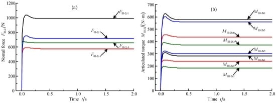 Based on Figure 24, it can be concluded that the normal contact forces, static torques of the hip joints, and static torques of the knee joints all instantaneously increase from the value of 0 to the maximum peak value, and then reduce from the maximum peak value to the constant value in a short time. The tendencies of curves of the normal contact force and articulated torques basically keep consistent with the practical situation of the heavy-duty six-legged robot.