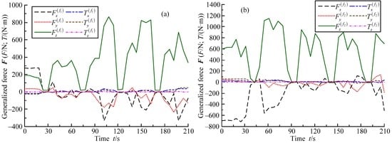 Although the data of the articulated torques are not collected because there are no torque sensors in the robot, the generalized forces of feet can be discretely collected by the six-dimension force sensors of the feet. The generalized force curves are shown in Figure 26. To keep the real data of the generalized forces, the generalized force curves are not smoothed. In Figure 26, the generalized force curves exhibit little perturbations. Two main reasons can be illustrated as follows. First, the rubber slabs and steel meshes are installed on the slope for enhancing the adhesion forces of the robot’s feet. They produce little deformation when the robot walks. Second, the quadrangular gait leads to the statically indeterminate problem. One leg may bear the small or big normal contact force in the short or long time. Although the generalized force curves present partial perturbations, they still have the much higher value in use.
