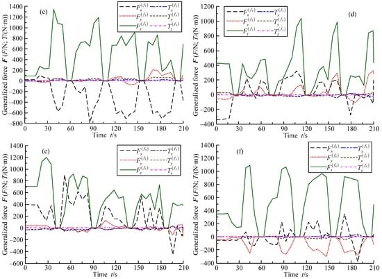 Generalized force curves of feet: (a) leg 1; (b) leg 2; (c) leg 3; (d) leg 4; (e) leg 5; and (f) leg 6.
