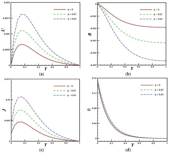 Effect of nanoparticle volume fraction on velocity (U), induced magnetic field (B); induced current density (J) and temperature field (θ) distributions when . Magnetic Prandtl number: Pm; nanoparticle volume fraction: .