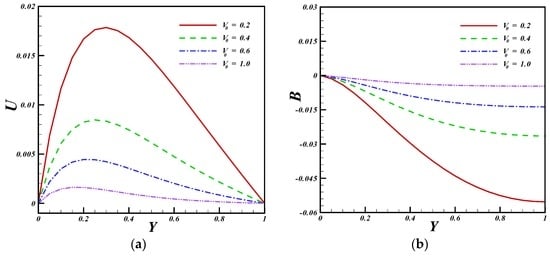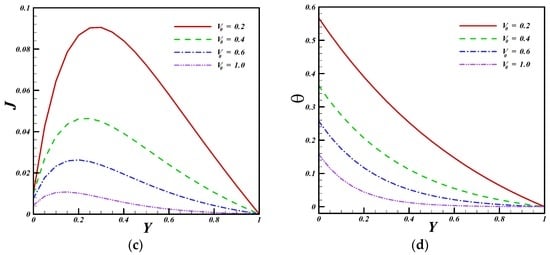 Impact of on induced magnetic field, current density, temperature and velocity distributions is shown in Figure 2. As volume fraction of nanofluid augments, nanofluid velocity and temperature are enhanced due to an increase in fluid motion by adding nanoparticles. Induced current density increases with an augment of while the opposite behavior is shown for induced magnetic field. Influence of suction parameter on hydrothermal behavior is depicted in Figure 3. Velocity, temperature and induced current density decreases, with an augment of suction parameter while induced magnetic field enhances with rise of . Therefore, this parameter can be considered as control parameter for engineering designs.