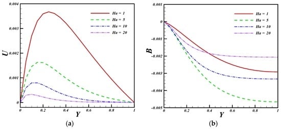 Effect of Hartmann number (Ha) on velocity (U); induced magnetic field (B) and induced current density(J) distributions when .