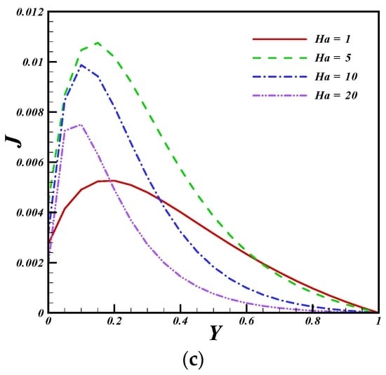 Figure 4 depicts the impacts of Lorentz forces on induced magnetic field, induced current density and velocity distributions. As Lorentz forces augments, the back flow appears and in turn velocity of nanofluid decreases. In addition, it can be seen that the maximum velocity point shifts to the hot wall. Induced magnetic field decreases with rise of magnetic field strength but induced current density is enhanced with the rise of Lorentz forces. Influence of on induced magnetic field, induced current density and velocity profiles is depicted in Figure 5. Without the magnetic field, the shape of the velocity profiles is parabolic but in the existence of the magnetic field its shape changes to being flattened. The nanofluid motion and induced magnetic field reduces with an augment of . Induced current density rises with augment of Pm.